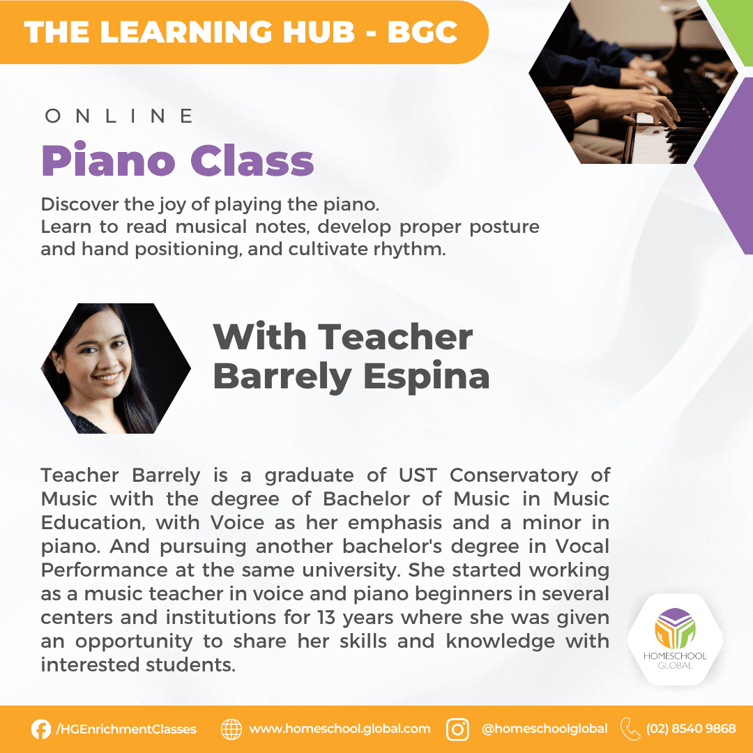 Teacher Barrely is a graduate of UST Conservatory of Music with the degree of Bachelor of Music in Music Education, with Voice as her emphasis and a minor in piano. And pursuing another bachelor’s degree in Vocal Performance at the same university. She started working as a music teacher in voice and piano beginners in several centers and institutions for 13 years where she was given an opportunity to share her skills and knowledge with interested students.